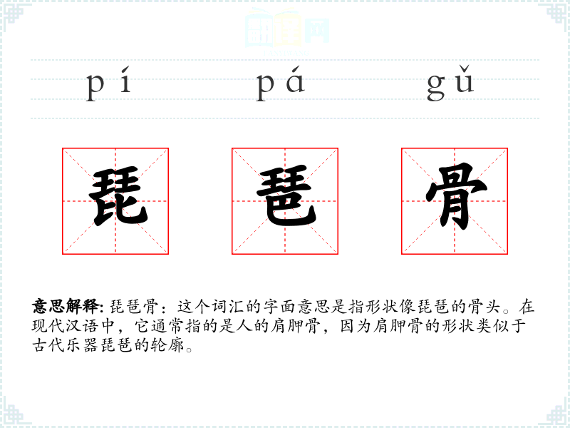 琵琶骨:这个词汇的字面意思是指形状像琵琶的骨头。在现代汉语中,它通常指的是人的肩胛骨,因为肩胛骨的形状类似于古代乐器琵琶的轮廓。