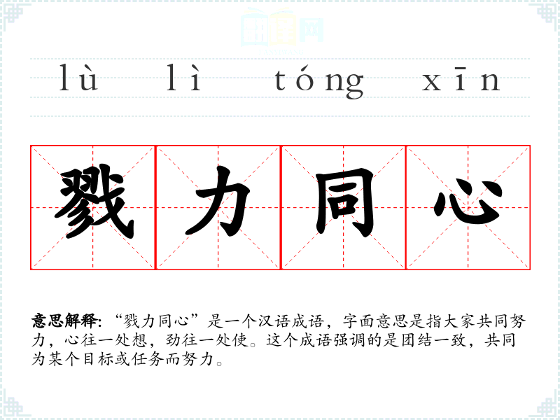 “戮力同心”是一个汉语成语,字面意思是指大家共同努力,心往一处想,劲往一处使。这个成语强调的是团结一致,共同为某个目标或任务而努力。