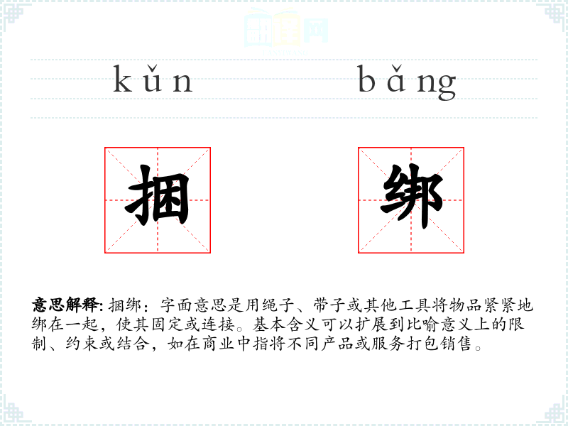 捆绑:字面意思是用绳子、带子或其他工具将物品紧紧地绑在一起,使其固定或连接。基本含义可以扩展到比喻意义上的限制、约束或结合,如在商业中指将不同产品或服务打包销售。