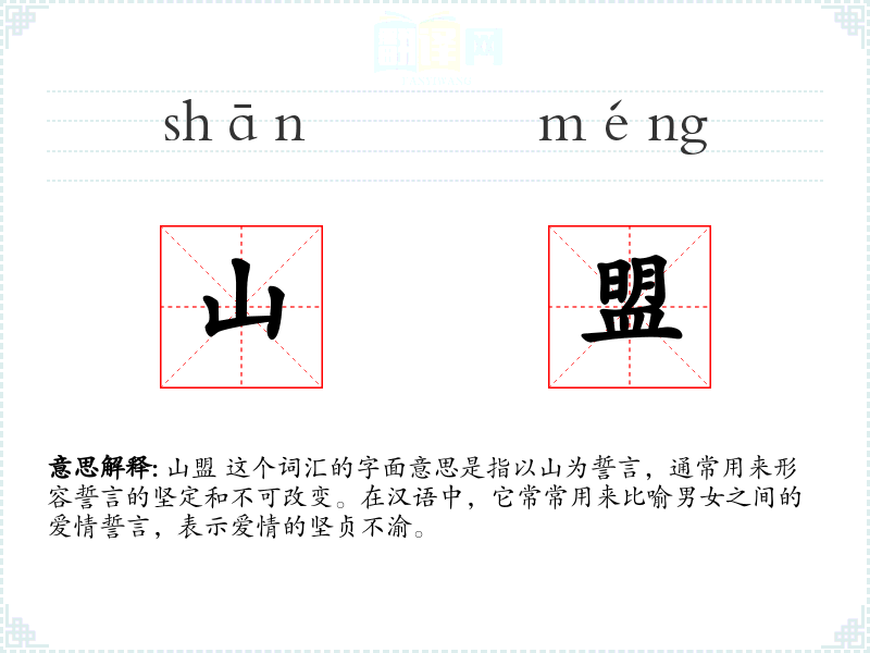 山盟 这个词汇的字面意思是指以山为誓言,通常用来形容誓言的坚定和不可改变。在汉语中,它常常用来比喻男女之间的爱情誓言,表示爱情的坚贞不渝。