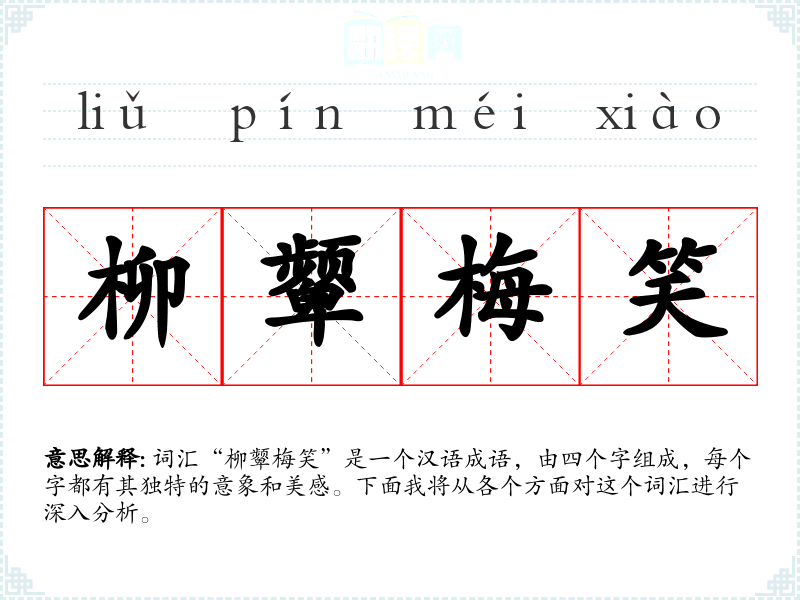 词汇“柳颦梅笑”是一个汉语成语,由四个字组成,每个字都有其独特的意象和美感。下面我将从各个方面对这个词汇进行深入分析。