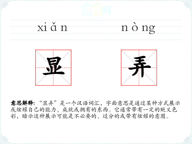 “显弄”是一个汉语词汇,字面意思是通过某种方式展示或炫耀自己的能力、成就或拥有的东西。它通常带有一定的贬义色彩,暗示这种展示可能是不必要的、过分的或带有炫耀的意图。