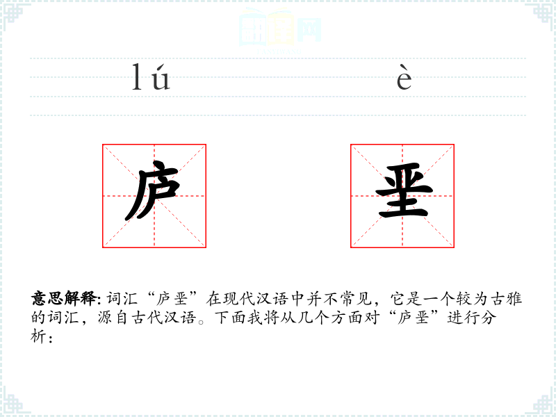 词汇“庐垩”在现代汉语中并不常见,它是一个较为古雅的词汇,源自古代汉语。下面我将从几个方面对“庐垩”进行分析: