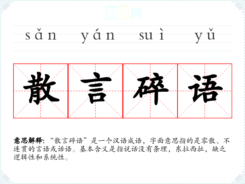 “散言碎语”这个成语的词源较为直接,由“散”和“碎”两个形容词加上“言”和“语”两个名词构成,形象地描述了言语的零散和不连贯。在古代文献中,这个成语就已经出现,并且在现代汉语中仍然广泛使用。