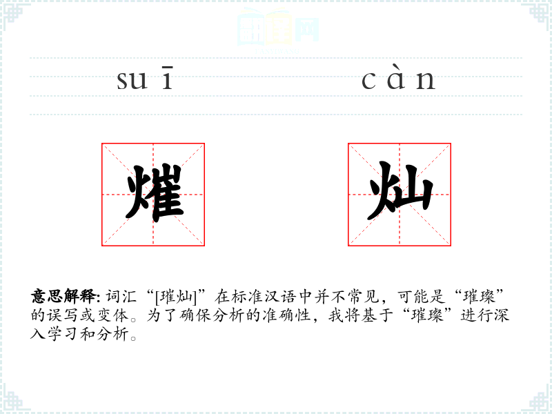 词汇“[璀灿]”在标准汉语中并不常见,可能是“璀璨”的误写或变体。为了确保分析的准确性,我将基于“璀璨”进行深入学*和分析。