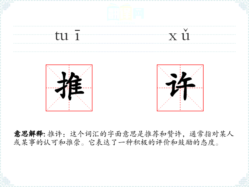推许:这个词汇的字面意思是推荐和赞许,通常指对某人或某事的认可和推崇。它表达了一种积极的评价和鼓励的态度。