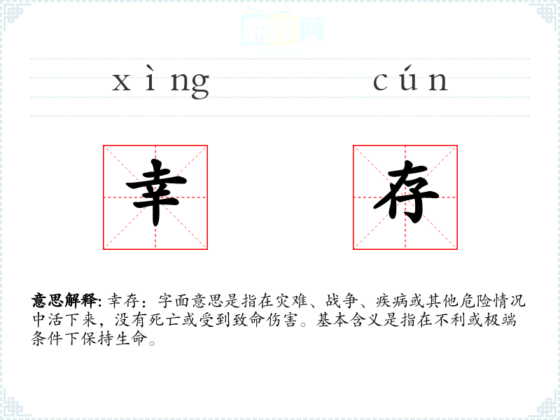 幸存:字面意思是指在灾难、战争、疾病或其他危险情况中活下来,没有死亡或受到致命伤害。基本含义是指在不利或极端条件下保持生命。