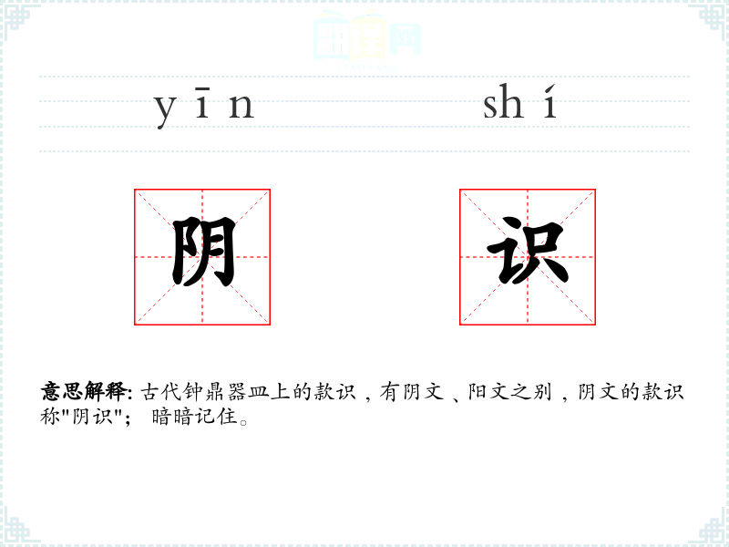 古代钟鼎器皿上的款识﹐有阴文﹑阳文之别﹐阴文的款识称"阴识"; 暗暗记住。