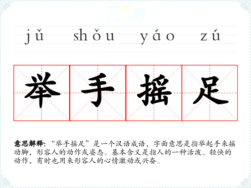 “举手摇足”是一个汉语成语,字面意思是指举起手来摇动脚,形容人的动作或姿态。基本含义是指人的一种活泼、轻快的动作,有时也用来形容人的心情激动或兴奋。