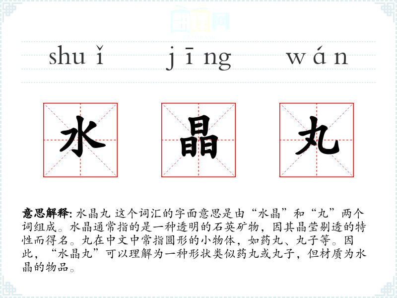 “水晶”一词源自古代汉语,最初指的是天然的水晶石。“丸”则是一个古老的汉字,用来描述圆形物体。两者结合形成的“水晶丸”在现代汉语中主要用于描述特定的装饰品或工艺品。