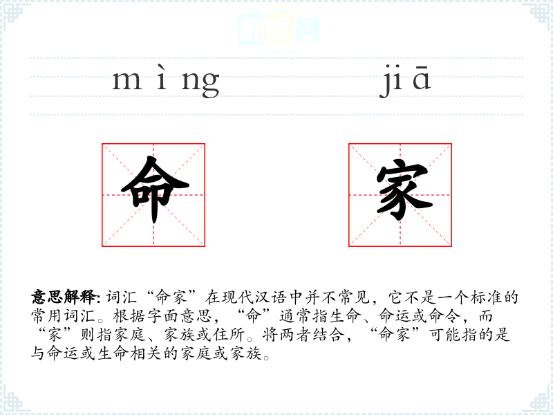 词汇“命家”在现代汉语中并不常见,它不是一个标准的常用词汇。根据字面意思,“命”通常指生命、命运或命令,而“家”则指家庭、家族或住所。将两者结合,“命家”可能指的是与命运或生命相关的家庭或家族。