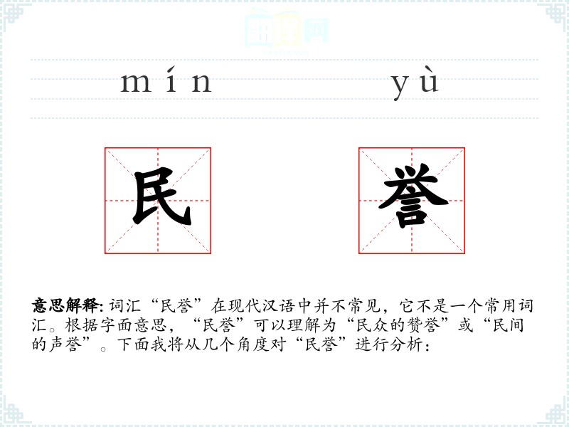 提到“民誉”,可能会联想到正面的社会评价、良好的公众形象以及民众的认可和支持。这个词带有积极的情感色彩。