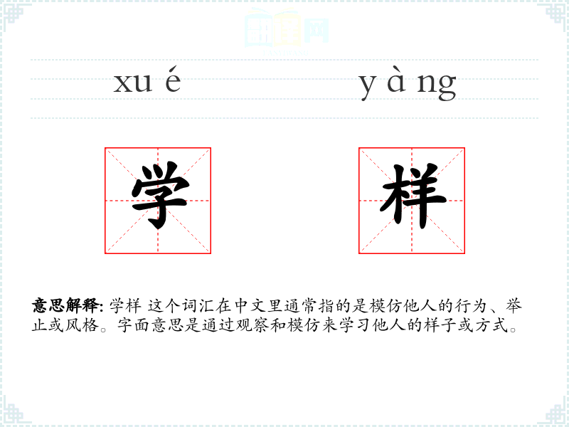 学样 这个词汇在中文里通常指的是模仿他人的行为、举止或风格。字面意思是通过观察和模仿来学*他人的样子或方式。