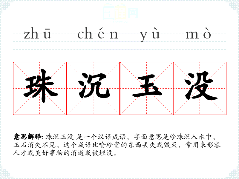 珠沉玉没 是一个汉语成语,字面意思是珍珠沉入水中,玉石消失不见。这个成语比喻珍贵的东西丢失或毁灭,常用来形容人才或美好事物的消逝或被埋没。