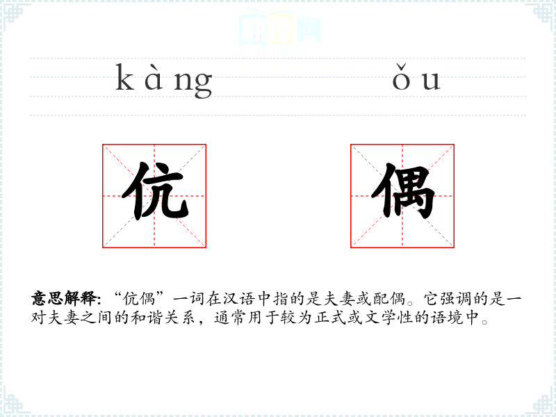 - 文学语境:在古典文学中,“伉偶”常用来形容夫妻间的深厚情感和和谐关系,如“伉偶情深”。