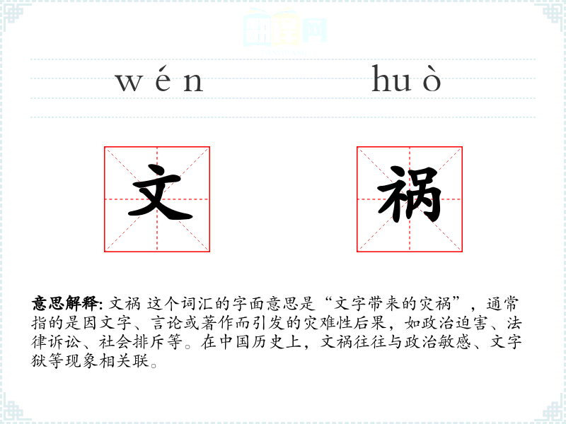 文祸 这个词汇的字面意思是“文字带来的灾祸”,通常指的是因文字、言论或著作而引发的灾难性后果,如政治迫害、法律诉讼、社会排斥等。在**历史上,文祸往往与政治敏感、文字狱等现象相关联。