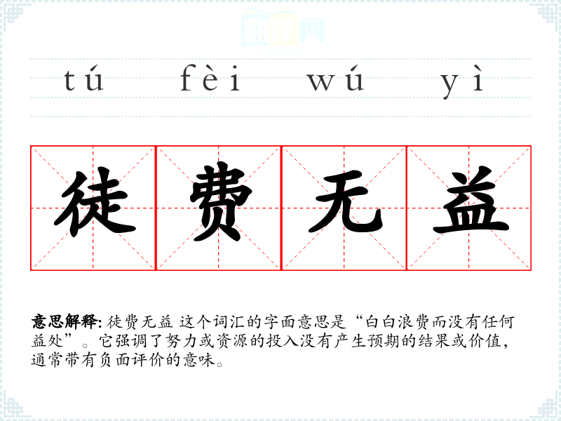 徒费无益 这个词汇的字面意思是“白白浪费而没有任何益处”。它强调了努力或资源的投入没有产生预期的结果或价值,通常带有负面评价的意味。