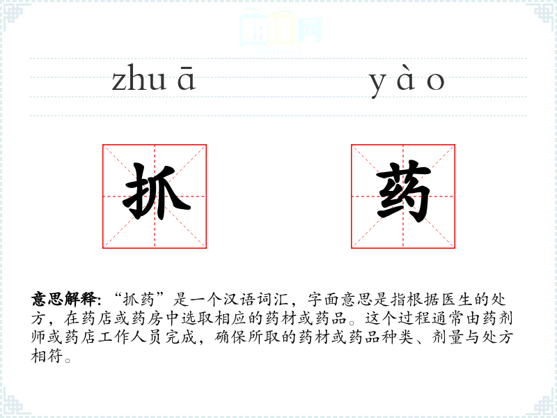 “抓药”是一个汉语词汇,字面意思是指根据医生的处方,在药店或药房中选取相应的药材或药品。这个过程通常由药剂师或药店工作人员完成,确保所取的药材或药品种类、剂量与处方相符。