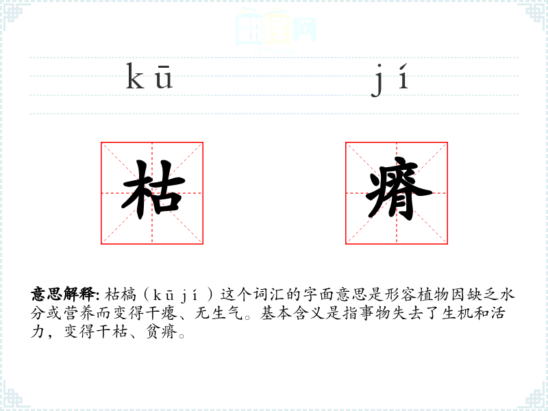 枯槁(kū jí)这个词汇的字面意思是形容植物因缺乏水分或营养而变得干瘪、无生气。基本含义是指事物失去了生机和活力,变得干枯、贫瘠。