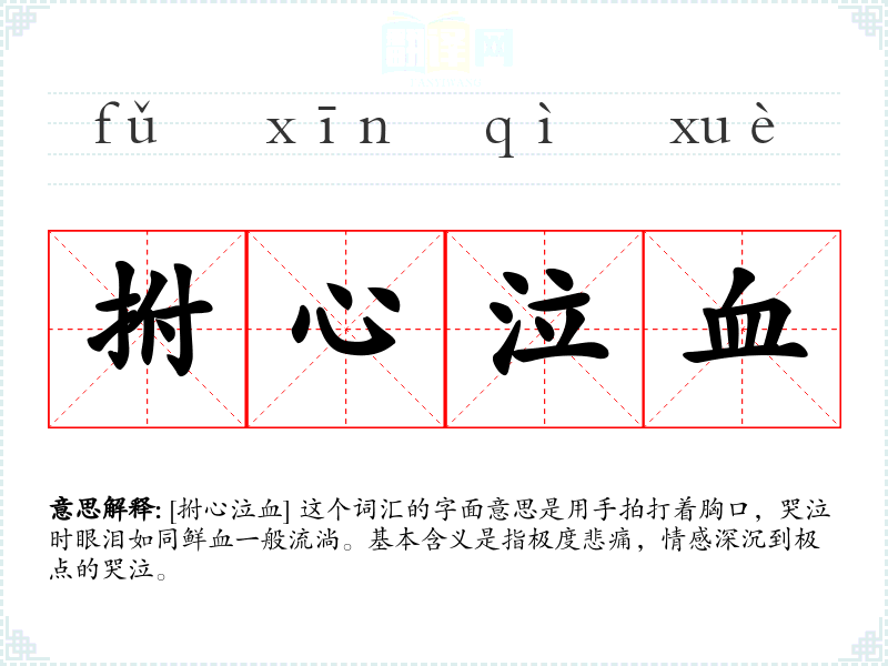 [拊心泣血] 这个词汇的字面意思是用手拍打着胸口,哭泣时眼泪如同鲜血一般流淌。基本含义是指极度悲痛,情感深沉到极点的哭泣。