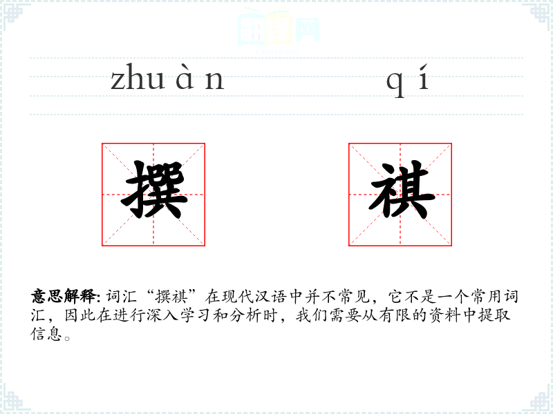 词汇“撰祺”在现代汉语中并不常见,它不是一个常用词汇,因此在进行深入学*和分析时,我们需要从有限的资料中提取信息。