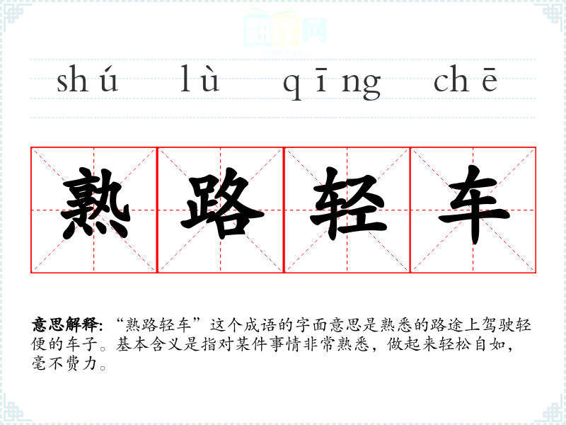 “熟路轻车”这个成语的字面意思是熟悉的路途上驾驶轻便的车子。基本含义是指对某件事情非常熟悉,做起来轻松自如,毫不费力。