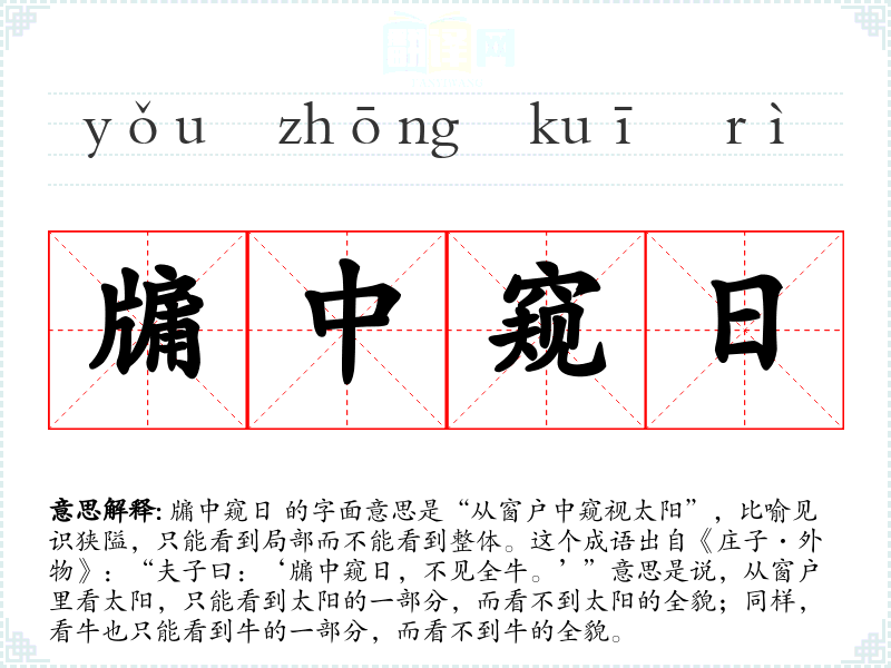 牖中窥日 的字面意思是“从窗户中窥视太阳”,比喻见识狭隘,只能看到局部而不能看到整体。这个成语出自《庄子·外物》:“夫子曰:‘牖中窥日,不见全牛。’”意思是说,从窗户里看太阳,只能看到太阳的一部分,而看不到太阳的全貌;同样,看牛也只能看到牛的一部分,而看不到牛的全貌。