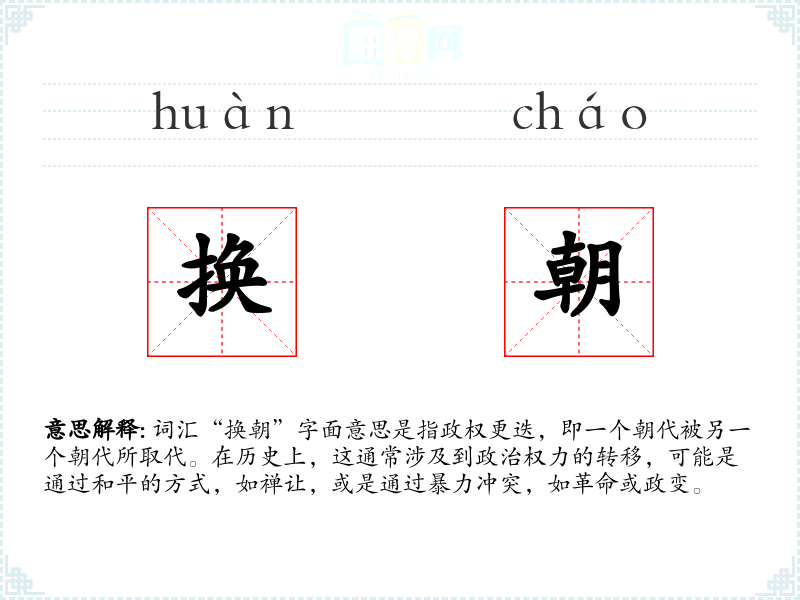 词汇“换朝”字面意思是指政权更迭,即一个朝代被另一个朝代所取代。在历史上,这通常涉及到政治权力的转移,可能是通过和平的方式,如禅让,或是通过暴力冲突,如革命或政变。