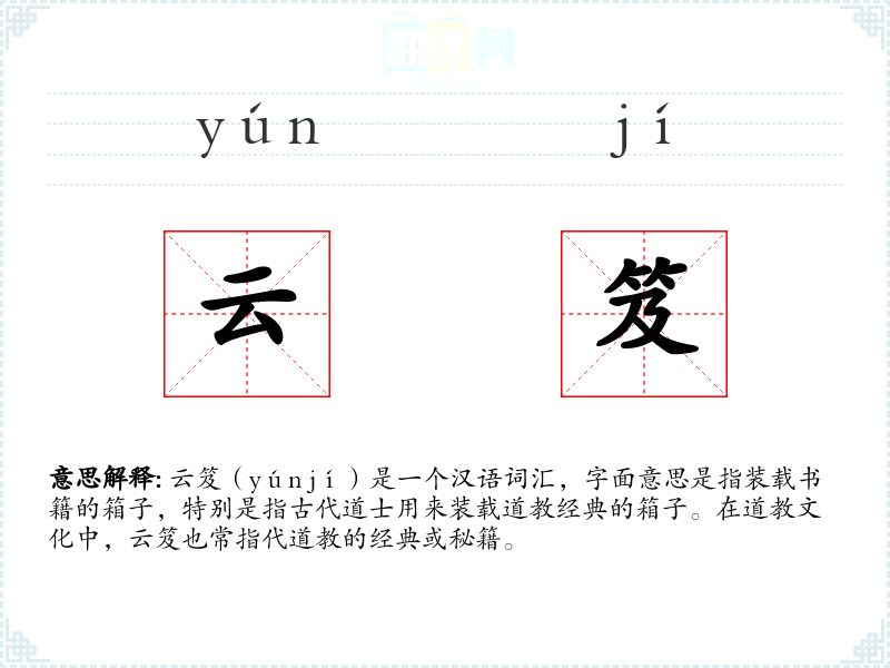 云笈(yún jí)是一个汉语词汇,字面意思是指装载书籍的箱子,特别是指古代道士用来装载道教经典的箱子。在道教文化中,云笈也常指代道教的经典或秘籍。