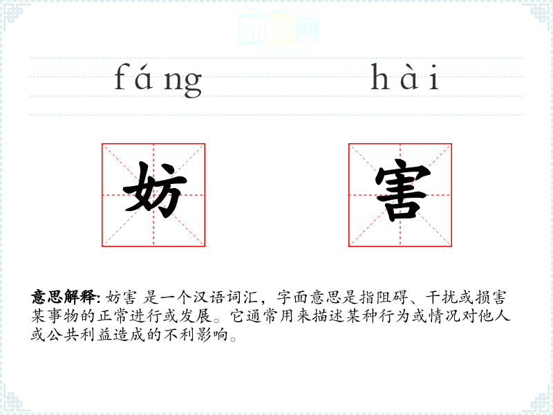 - 专业领域:在法律或医学等领域,妨害可能有更具体的含义,如“妨害公务”或“妨害健康”。