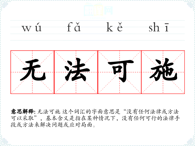 无法可施 这个词汇的字面意思是“没有任何法律或方法可以采取”,基本含义是指在某种情况下,没有任何可行的法律手段或方法来解决问题或应对局面。