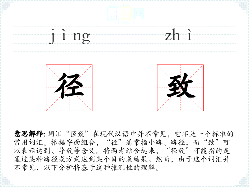 - 反义词:无(由于“径致”不是一个常用词汇,反义词难以确定)