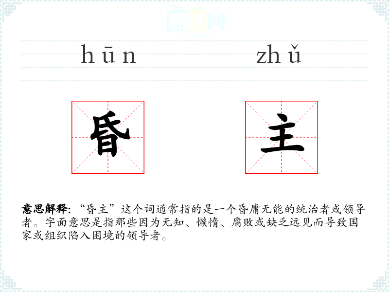 “昏主”这个词源于汉语,其中“昏”指的是昏暗、无知,而“主”指的是领导者或统治者。在历史上,这个词经常被用来描述那些因为个人原因而导致国家衰败的君主。
