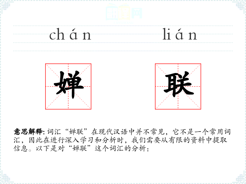 词汇“婵联”在现代汉语中并不常见,它不是一个常用词汇,因此在进行深入学习和分析时,我们需要从有限的资料中提取信息。以下是对“婵联”这个词汇的分析: