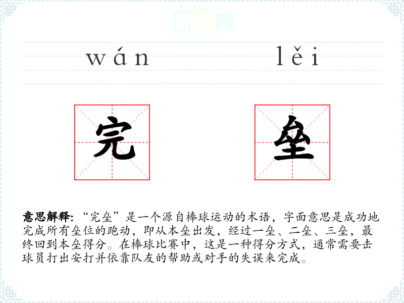 在棒球专业领域,“完垒”是一个核心概念,用于描述一种成功的得分方式。在文学和口语中,这个词汇有时也被用来比喻性地描述一个人或团队在某个任务或项目中从头到尾成功完成,尤其是在面对困难和挑战时。