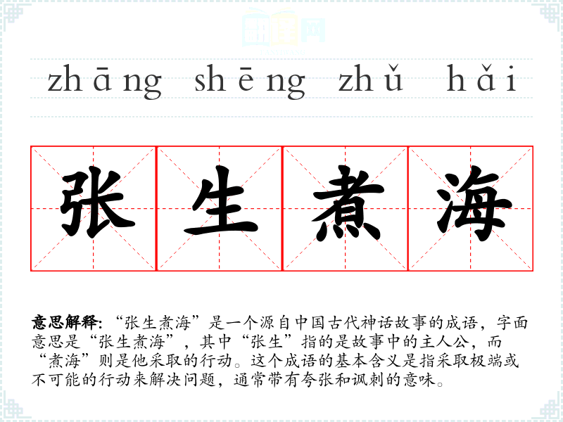 “张生煮海”是一个源自**古代神话故事的成语,字面意思是“张生煮海”,其中“张生”指的是故事中的主人公,而“煮海”则是他采取的行动。这个成语的基本含义是指采取极端或不可能的行动来解决问题,通常带有夸张和讽刺的意味。