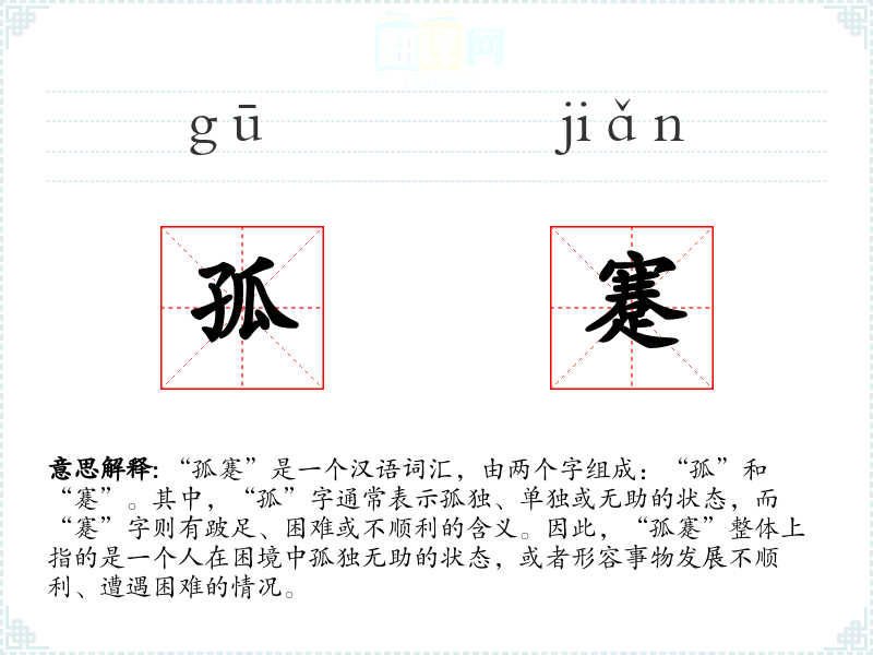 “孤蹇”是一个汉语词汇,由两个字组成:“孤”和“蹇”。其中,“孤”字通常表示孤独、单独或无助的状态,而“蹇”字则有跛足、困难或不顺利的含义。因此,“孤蹇”整体上指的是一个人在困境中孤独无助的状态,或者形容事物发展不顺利、遭遇困难的情况。