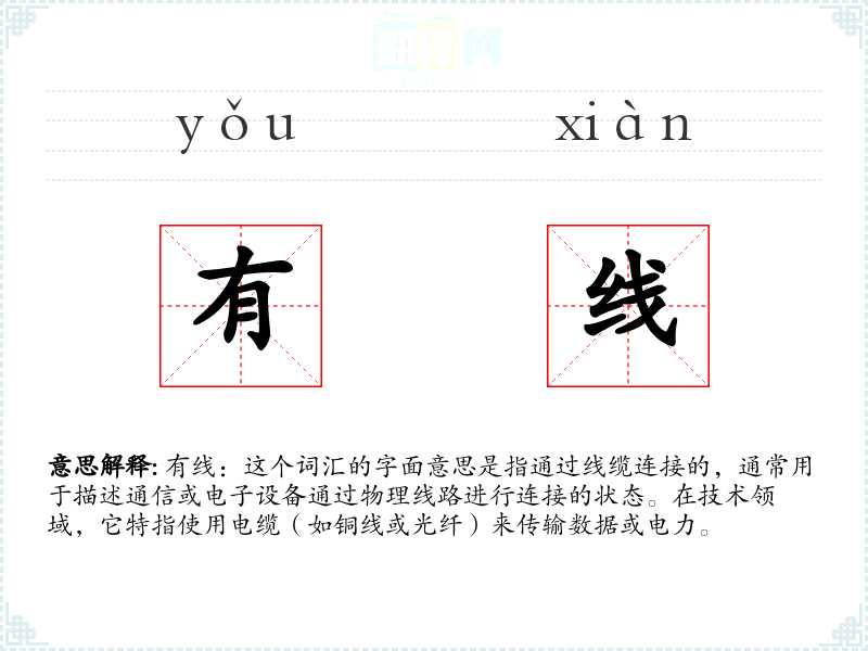 有线:这个词汇的字面意思是指通过线缆连接的,通常用于描述通信或电子设备通过物理线路进行连接的状态。在技术领域,它特指使用电缆(如铜线或光纤)来传输数据或电力。