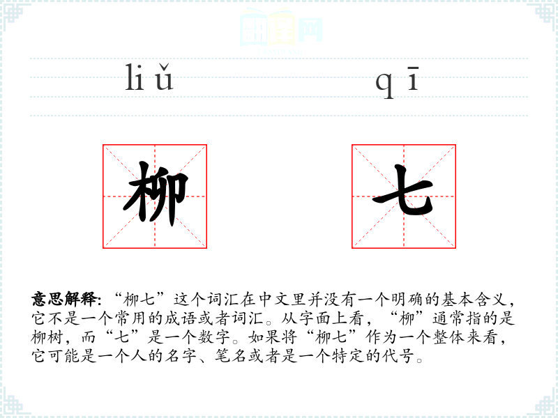“柳七”这个词汇在中文里并没有一个明确的基本含义,它不是一个常用的成语或者词汇。从字面上看,“柳”通常指的是柳树,而“七”是一个数字。如果将“柳七”作为一个整体来看,它可能是一个人的名字、笔名或者是一个特定的代号。