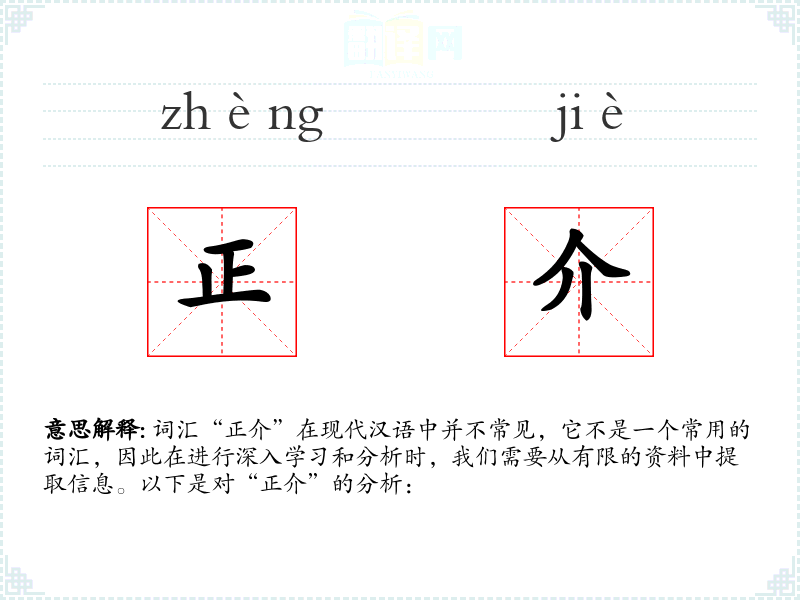 由于“正介”不是一个常用词汇,它在不同语境下的使用非常有限。可能在一些古代文献或特定领域的专业文献中会出现,但具体情况需要查阅相关资料才能确定。