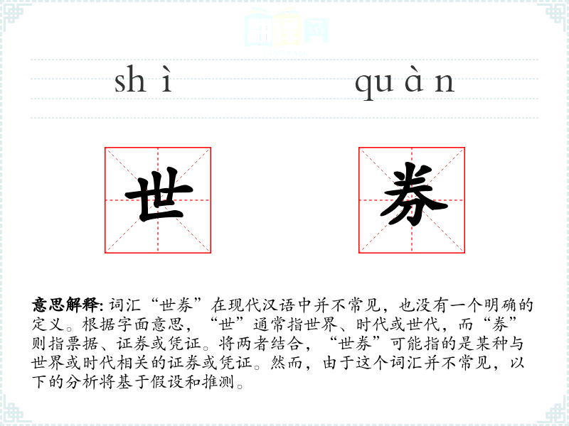 “世券”可能指的是一种具有时代特征或全球影响力的证券或凭证。它可能与特定的历史时期、文化背景或全球经济活动相关联。