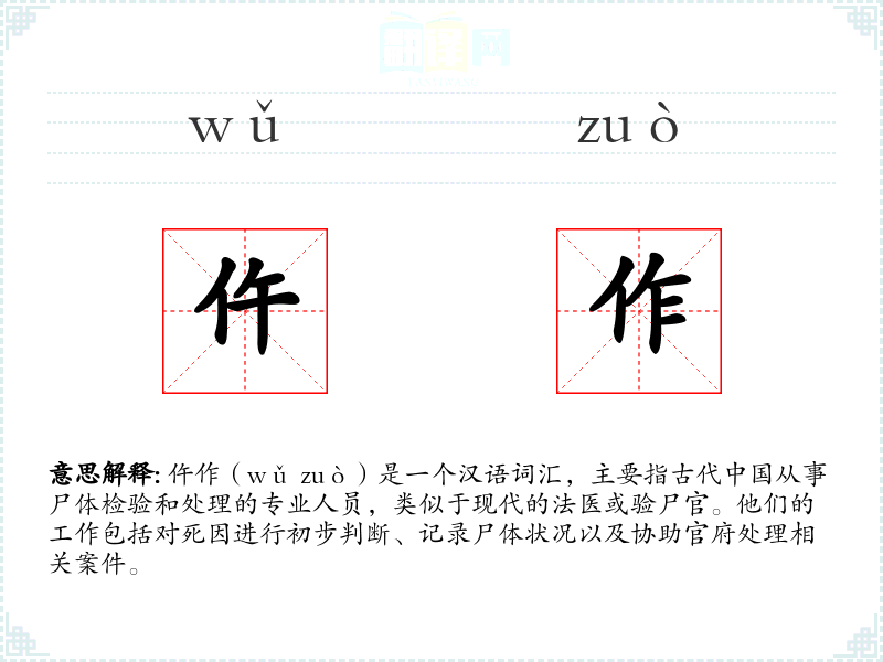 仵作(wǔ zuò)是一个汉语词汇,主要指古代**从事尸体检验和处理的专业人员,类似于现代的法医或验尸官。他们的工作包括对死因进行初步判断、记录尸体状况以及协助官府处理相关案件。