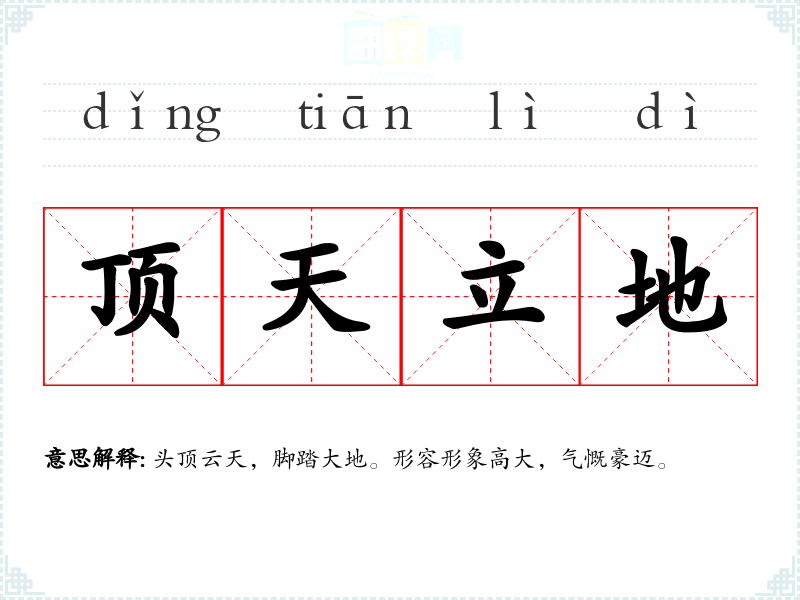 头顶云天,脚踏大地。形容形象高大,气慨豪迈。