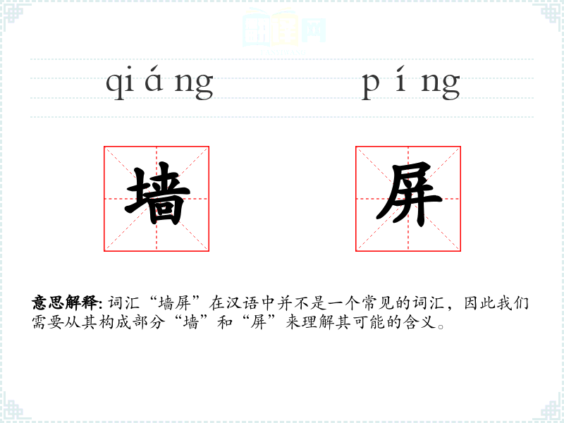词汇“墙屏”在汉语中并不是一个常见的词汇,因此我们需要从其构成部分“墙”和“屏”来理解其可能的含义。