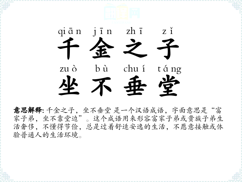 千金之子,坐不垂堂 是一个汉语成语,字面意思是“富家子弟,坐不靠堂边”。这个成语用来形容富家子弟或贵族子弟生活奢侈,不懂得节俭,总是过着舒适安逸的生活,不愿意接触或体验普通人的生活环境。