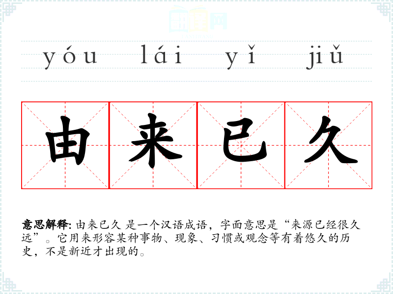 由来已久 是一个汉语成语,字面意思是“来源已经很久远”。它用来形容某种事物、现象、*惯或观念等有着悠久的历史,不是新近才出现的。
