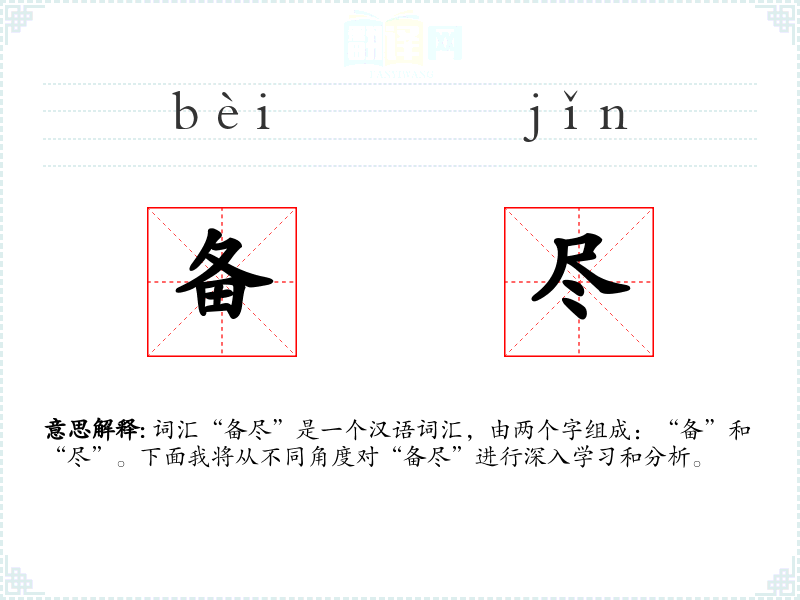 词汇“备尽”是一个汉语词汇,由两个字组成:“备”和“尽”。下面我将从不同角度对“备尽”进行深入学*和分析。
