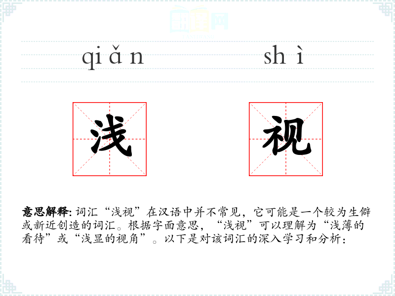 词汇“浅视”在汉语中并不常见,它可能是一个较为生僻或新近创造的词汇。根据字面意思,“浅视”可以理解为“浅的看待”或“浅显的视角”。以下是对该词汇的深入学和分析: