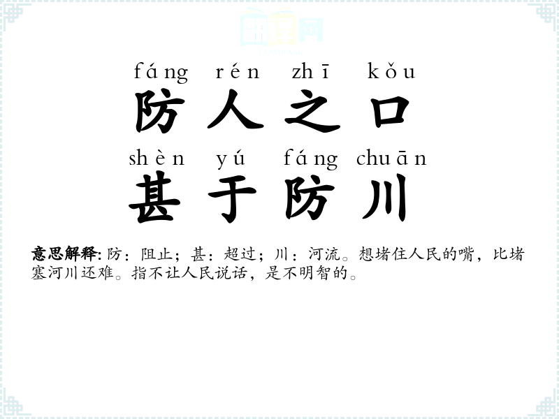 防:阻止;甚:超过;川:河流。想堵住人民的嘴,比堵塞河川还难。指不让人民说话,是不明智的。