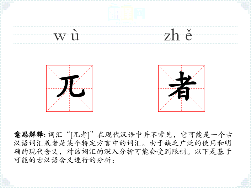 词汇“[兀者]”在现代汉语中并不常见,它可能是一个古汉语词汇或者是某个特定方言中的词汇。由于缺乏广泛的使用和明确的现代含义,对该词汇的深入分析可能会受到限制。以下是基于可能的古汉语含义进行的分析: